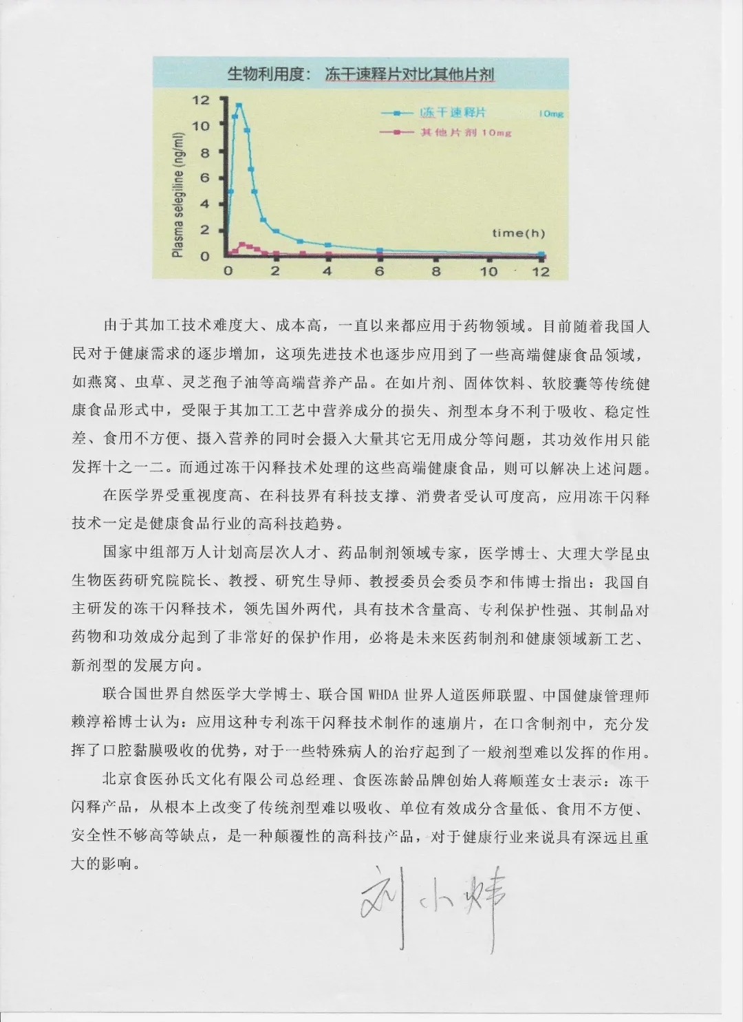 联合国世界自然医学大学博士、联合国WHDA世界人道医师联盟、中国健康管理师赖淳裕博士认为:应用这种专利冻干闪释技术制作的速崩片,在口含制剂中,充分发挥了口腔黏膜吸收的优势,对于一些特殊病人的治疗起到了一般剂型难以发挥的作用。