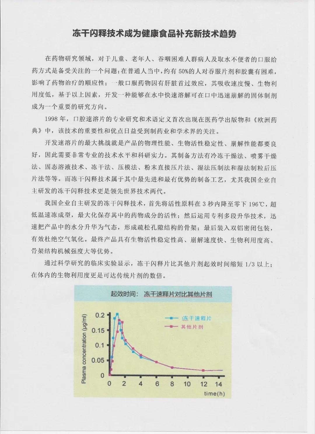 通过科学研究的临床实验显示,冻干闪释片比其他片剂起效时间缩短1/3以上;在体内的生物利用度更是可达传统片剂的数倍。